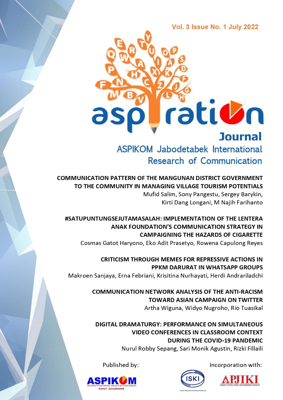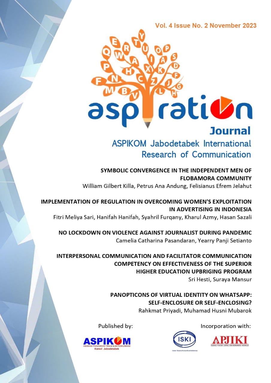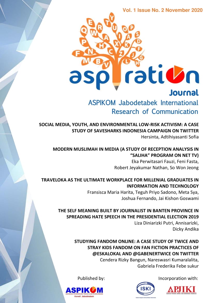 "ASPIRATION" is an acronym for ASPIKOM Jabodetabek International Research of Communication. ASPIRATION Journal published by ASPIKOM Jakarta, Bogor, Depok, Tangerang, and Bekasi Regions supports the mission of ASPIKOM (Communication Science in Higher Education Association), especially intending to develop communication through participation and collaboration from researchers and practitioners with scientific works that altogether able to develop a comprehensive communication science traditions with a broader perspective. We expect work that addresses the current problem in the national and international context.